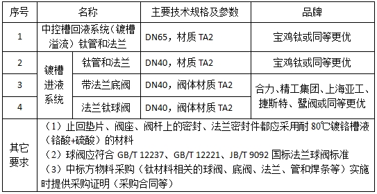 自動鍍鉻生產線現有鍍槽-中控槽鍍液循環系統塑料材質管道(管道、接頭與閥體)使用到一定年限老化,其中的溢流管路、回液管路及閥件將更新為鈦材料。
