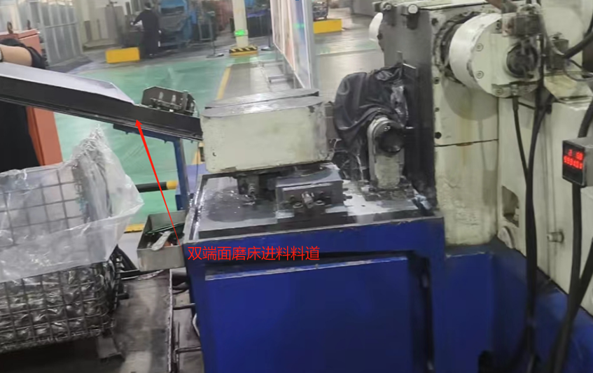 (來(lái)料)料籃整框上料→雙端面磨床進(jìn)料槽→磨削→雙端面磨床出料槽→計(jì)數(shù)→分料 →進(jìn)出料箱