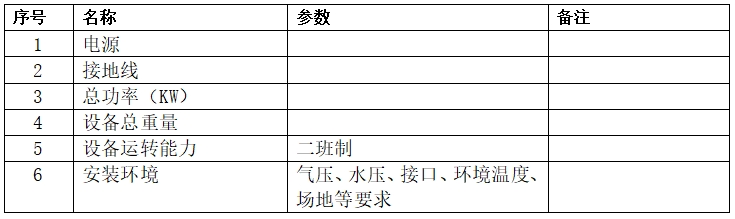 3.設(shè)備其他技術(shù)指標(biāo):(需含設(shè)備總功率、電壓、電流、氣壓、水壓、接口、環(huán)境溫度、場(chǎng)地等安裝環(huán)境有關(guān)要求)