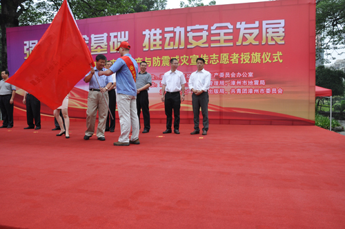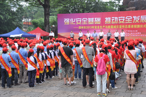 今年5月份是全市第二個防震減災(zāi)宣傳月,6月份是全國第十二個“安全生產(chǎn)月”。6月13日上午,公司黨委副書記張?zhí)┥鷰ьI(lǐng)15名安全生產(chǎn)志愿者代表國資系統(tǒng)參加漳州市2013年安全生產(chǎn)與防震減災(zāi)宣傳志愿者授旗儀式